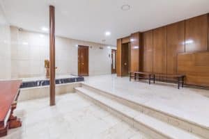La casa cuenta con siete plantas y tres vecinos por planta; calefacción central (Gas Natural), ascensor y montacargas, conserje de mañana y tarde.